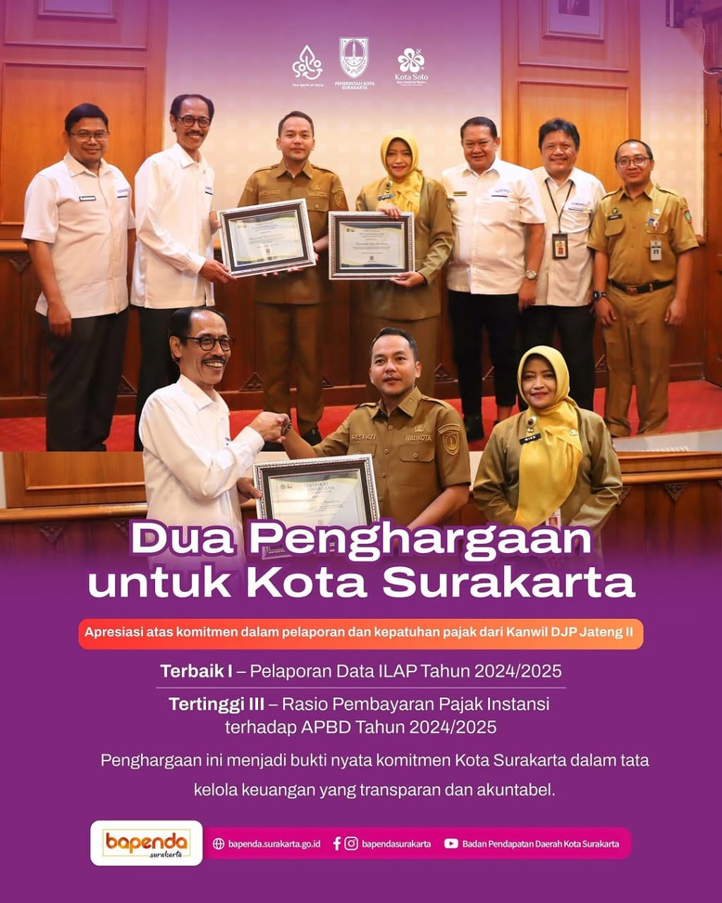 Apresiasi atas komitmen dalam pelaporan dan kepatuhan pajak dari Kanwil DJP Jateng II, Terbaik I - Pelaporan Data ILAP Tahun 2024/2025 Tertinggi III - Rasio Pembayaran Pajak Instansi terhadap APBD Tahun 2024/2025 Penghargaan ini menjadi bukti nyata komitmen Kota Surakarta dalam tata kelola...