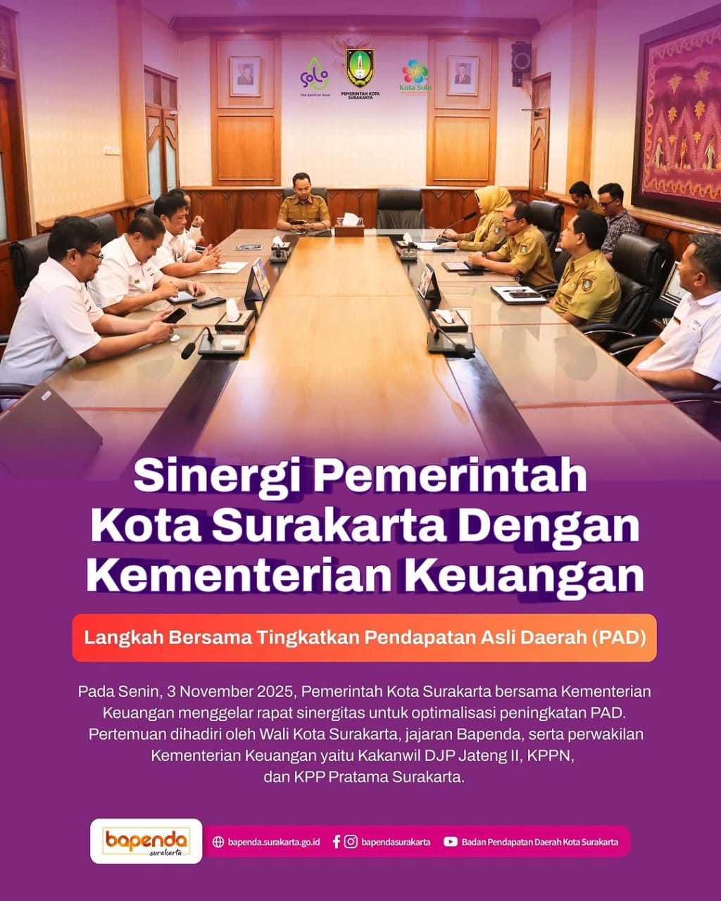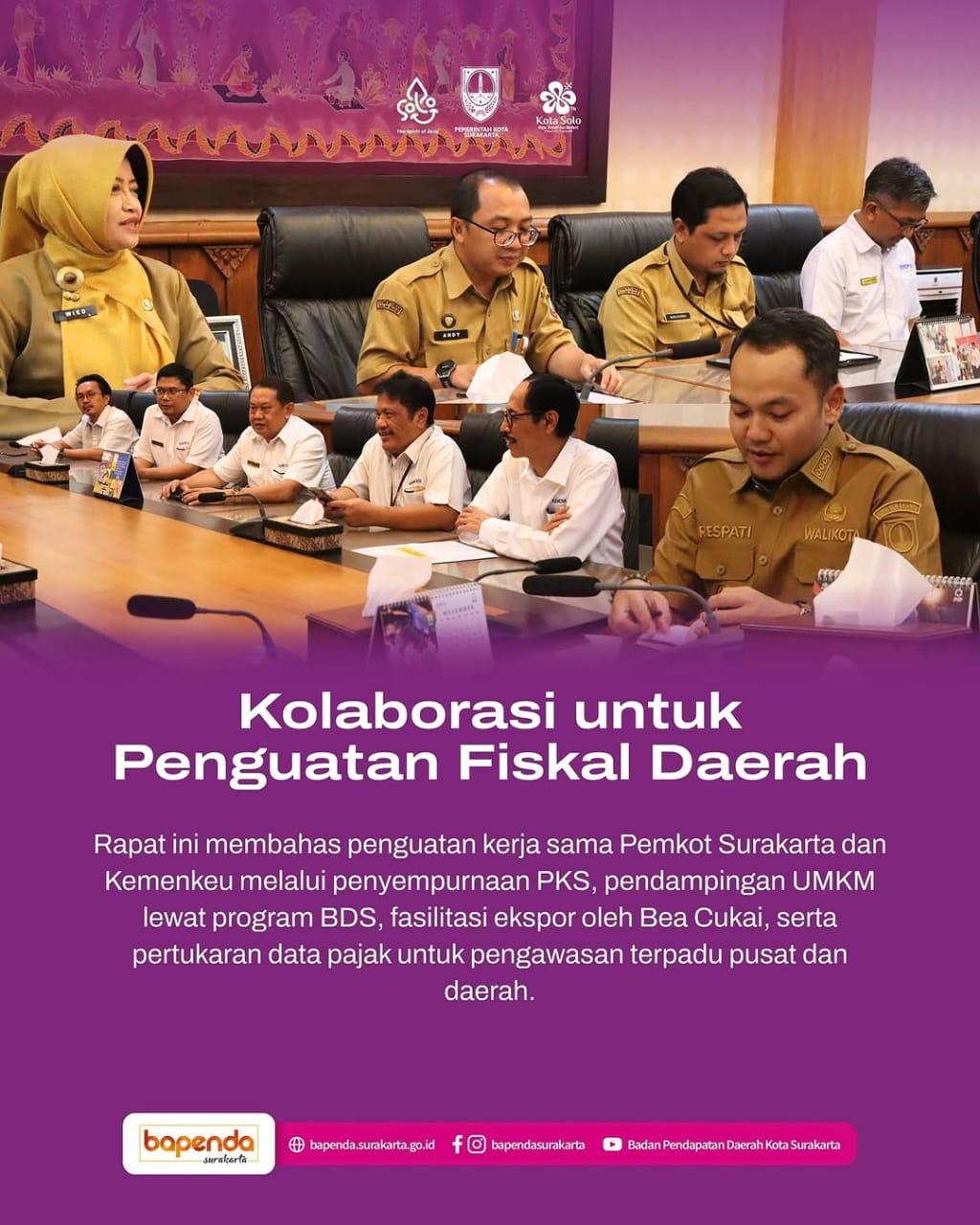 Langkah Bersama Tingkatkan Pendapatan Asli Daerah Pemerintah Kota Surakarta bersama Kementerian Keuangan menggelar rapat sinergitas untuk optimalisasi Peningkatan PAD, Pertemuan yang dihadiri oleh Wali Kota Surakarta, jajaran Bapenda Kota Surakarta, serta Perwakilan Kementerian Keuangan dar...