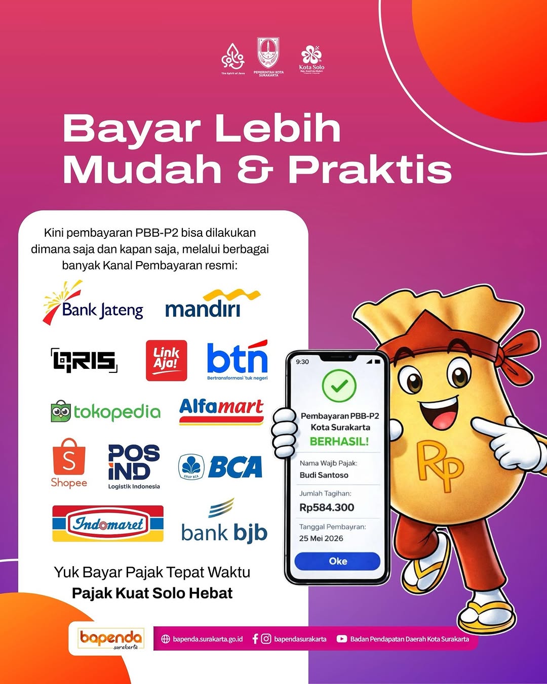 Masyarakat Kota Surakarta dapat melakukan pembayaran kapan saja dan dimana saja melalui berbagai kanal pembayaran resmi yang telah tersedia