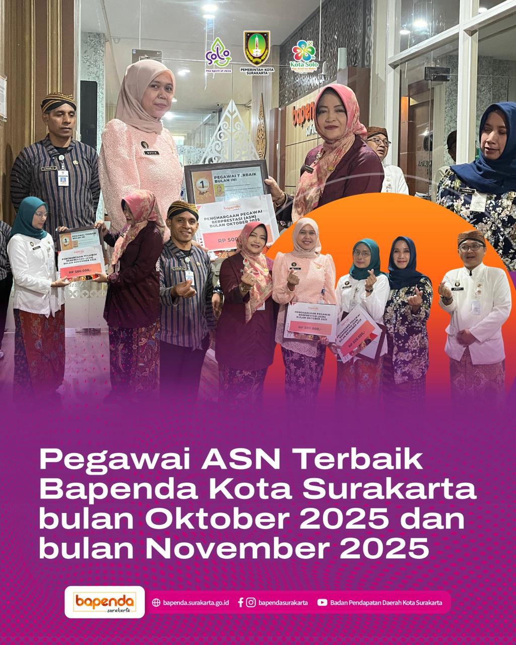 Pemberian Penghargaan ASN Berprestasi bulan Oktober 2025 dan bulan November 2025 diserahkan langsung oleh Kepala Badan Pendapatan Daerah Kota Surakarta, Terima kasih atas semangat, kerja keras dan kontribusinya. Terus menjadi teladan buat kita semua!
