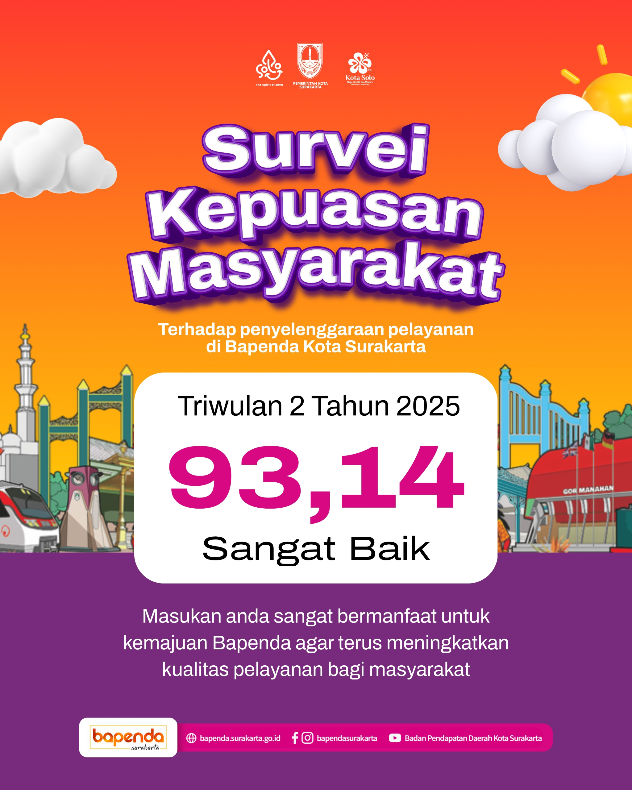 Terima kasih, Warga Solo! 🙌 Hasil Survei Kepuasan Masyarakat Triwulan 3 Tahun 2025 terhadap pelayanan di Bapenda Kota Surakarta meraih nilai 93,36 (Sangat Baik). Apresiasi ini menjadi motivasi kam...